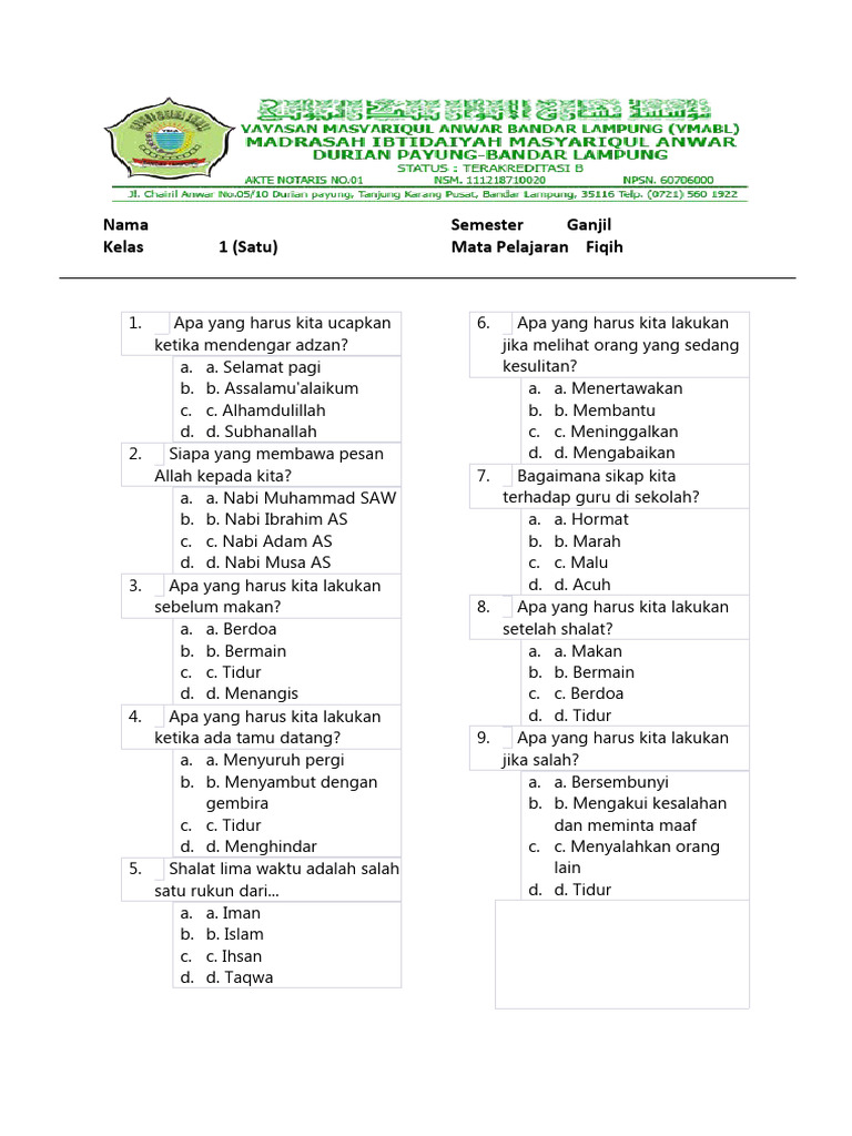 Artikel ini akan menyajikan contoh-contoh soal fikih kelas 1 yang berfokus pada kalimat thayyibah, disertai dengan penjelasan mendalam mengenai tujuan, jenis soal, dan bagaimana soal-soal ini dapat membantu siswa memahami dan mengamalkan ucapan-ucapan baik tersebut. Dengan panjang sekitar 1.200 kata, kita akan mengupas tuntas bagaimana contoh soal ini dapat menjadi alat yang efektif dalam memupuk keimanan anak sejak dini.