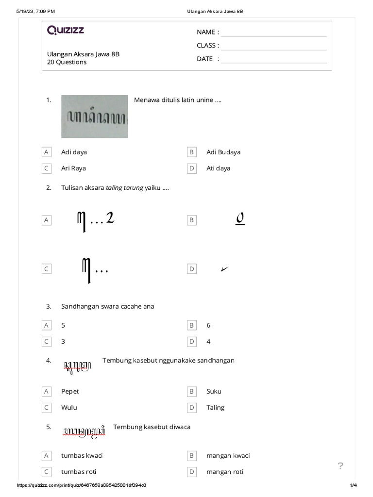 - Pilihan Ganda (Multiple Choice): Menguji pengenalan aksara, sandhangan, pasangan, atau aturan dasar.